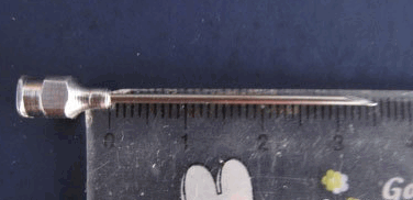 这是猪头部的切面图以及针头的照片。请大家注意猪的右耳根和肌肉的位置。大家会发现,右耳根上部的水平线和右耳根下部水平线之间恰是肌肉最丰富的区域,这就给我们找到了打针的横向坐标。那么纵向坐标呢。如下图