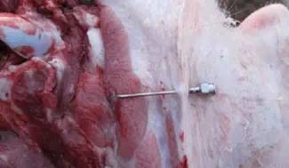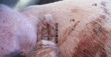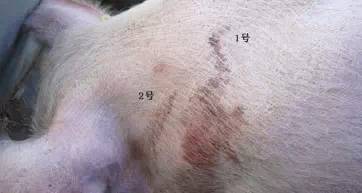 对于100公斤以上的成年猪,一般是食指,中指,无名指三指并拢,食指外侧(这才是是正确位置)的竖向区域就是正确的打针位置。针打的正确,在推注射器的时候感觉有一定阻力但推进顺畅,注射后猪不会疼的乱跑,注射位置不流液体。如果打到脂肪层中,推注射器会感觉阻力很大,推进时猪反抗强烈,推完注射部位明显见肿,针口流药水或血水。还要注意的是成年猪打针一定要用绑定器,俗称猪套子保定住,防止猪跑动中针头在肌肉中运动造成肌肉损伤。还有一种感觉更要格外注意,注射器推进几乎没有阻力,极为顺畅,多为打在脂肪与肌肉层的中间,那样产生的囊肿更大,如第一张图所示。