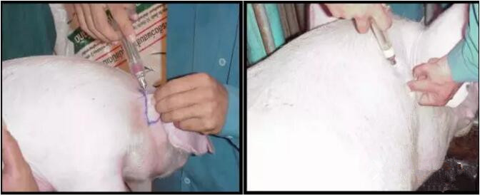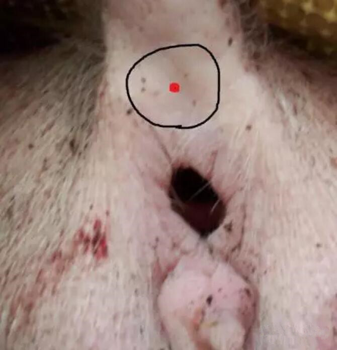 后海穴注射操作方法:提起尾部,用酒精等做常规的消毒,然后将针头对准凹陷中央,平行与直肠或稍向上进入,进针深度为保育猪1cm-1.5cm;育肥猪在2cm-4cm之间;公猪与母猪4cm左右。注意进针过程不可向下刺,避免破坏直肠,造成免疫失败。