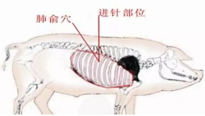 胸腔注射操作方法:在猪的右侧胸腔,倒数6-7根肋骨之间,在倒数第六肋骨前缘与胸壁垂直进针,注射前对注射部位剪毛消毒;然后将注射的皮肤前移0.5-1cm,插针回抽为真空然后缓慢注射,最后做局部消毒。