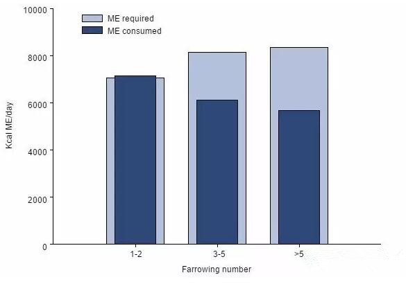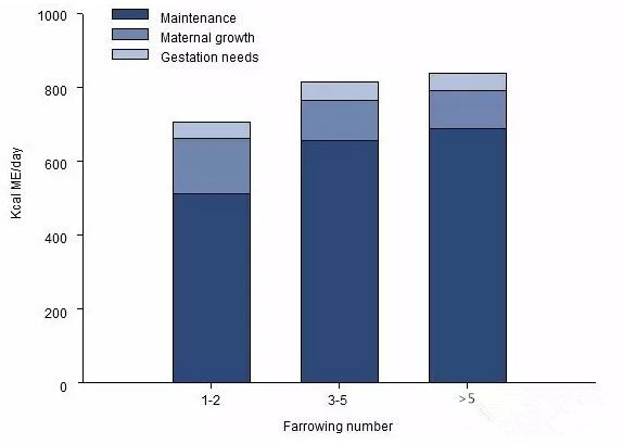 综合收集到的信息及结合NRC(2012),他们推算出了妊娠母猪每天的代谢能需要量,及能量用于维持、生长或储备、妊娠(子宫、附件、乳腺发育)的比例。还计算了摄入ME的总数,及母猪不同胎次(1-2胎,3-5胎,>5胎)营养需求被满足的程度。