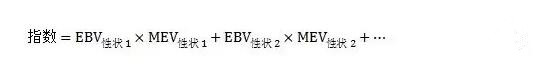 现代种猪遗传改良使用指数来综合衡量在生产实践中具有重要经济价值的多个性状。指数结合了用于衡量不同个体各个性状的性能表现差异的遗传价值(EBV – 估计育种值)及对应的各个性状的经济价值(MEV – 实测经济价值)(公式1)。将性状的遗传价值乘以经济价值,然后,将各个性状的数值加和,以反映每个个体在群体中的相对盈利潜力,用于选择最优秀的个体。