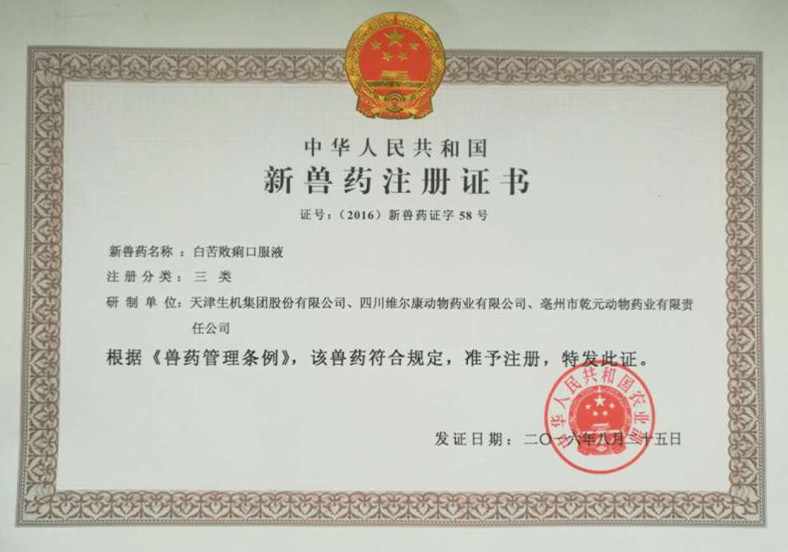 四川维尔康动物药业有限公司与北京农学院、天津生机集团股份有限公司、亳州市乾元动物药业有限公司等单位合作,历经数年的潜心研究,经过大量的科学验证,终于喜结硕果。日前,经农业部审批于2440号公告中宣布——“白苦败痢口服液”被批准为国家三类新兽药!新兽药证号为(2016)新兽药证字58号。