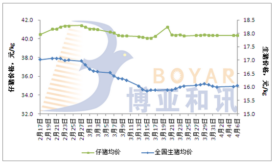 据博亚和讯监测,2017年4月6日全国外三元生猪均价为16.02元/公斤,较4月5日下降0.02元/公斤;仔猪均价为40.37元/公斤,较4月5日持平;今日白条肉均价22元/公斤,较4月5日上涨0.38元/公斤。今日猪料比价为6.19:1,较4月5日下降0.01;猪粮比10.45:1,较4月5日下降0.01。