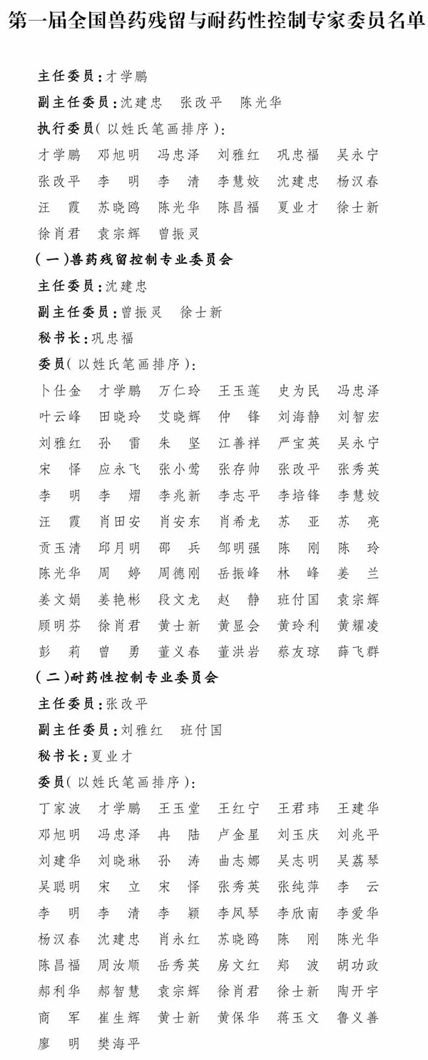 该委员会由兽药、饲料、渔业、卫生、食品等领域116位专家组成,将为兽药残留控制、动物源细菌耐药性防控工作推进提供技术支撑。全国兽药残留与耐药性控制专家委员会下设兽药残留和耐药性控制两个专业委员会,在农业部领导下,承担有关兽药残留、抗菌药物耐药性等方面的风险评估工作,提供风险管理和政策建议;制修订兽药残留国家标准,建立动物源细菌耐药性研究项目,为兽药残留监控、动物源细菌耐药监测、监管体系建设与完善提供专业指导;加强兽药残留监管,强化兽用抗菌药物管理,切实保障养殖业生产安全、动物源性食品安全、公共卫生安全和生态环境安全。