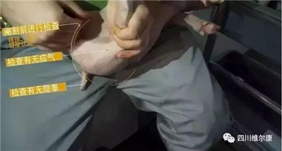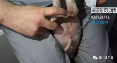 (3)德国阉猪操作切口要求稍微大点,切口在睾丸下方,便于液体流出。