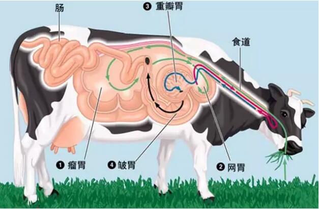 牛反刍是因为牛胃的特殊设置,牛胃分为瘤胃、网胃、瓣胃和皱胃四部分,其中只有皱胃是分泌胃液的部分。牛瘤胃的容积为100~300升,约占四部分胃的80%,瘤胃内有大量微生物,包括原生动物(纤毛虫为主)和细菌,瘤胃本身并不分泌酶,所有瘤胃内的酶全是由微生物产生,草料中的纤维质在这些微生物所产生的酶的作用下发酵分解,所形成的低级脂肪酸,大部分即被瘤胃壁所吸收。网胃在瘤胃前方,抵着横隔和肝,网胃内壁呈蜂窝状,网胃内同样进行着微生物消化。