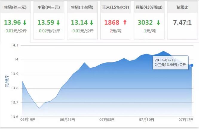 2017年7月18日全国外三元均价13.96元/公斤,较昨日下跌0.01元/公斤。