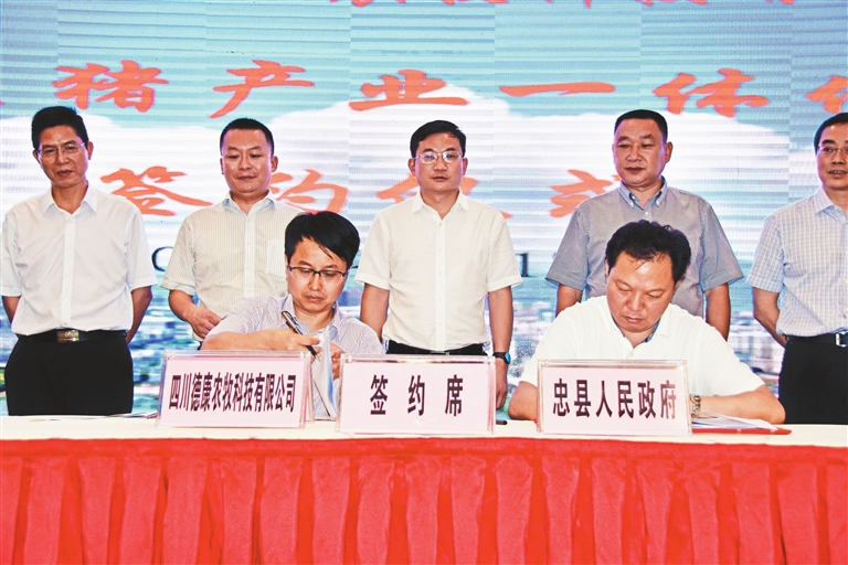 7月17日,忠县人民政府与华西希望·德康集团在海新酒店举行签约仪式,标志着50万头生猪产业一体化项目正式落户忠县。忠县县委书记赖蛟强调,各相关部门和重点镇要全力以赴做好土地流转、猪舍建设等相关工作,让项目尽快投产达效。