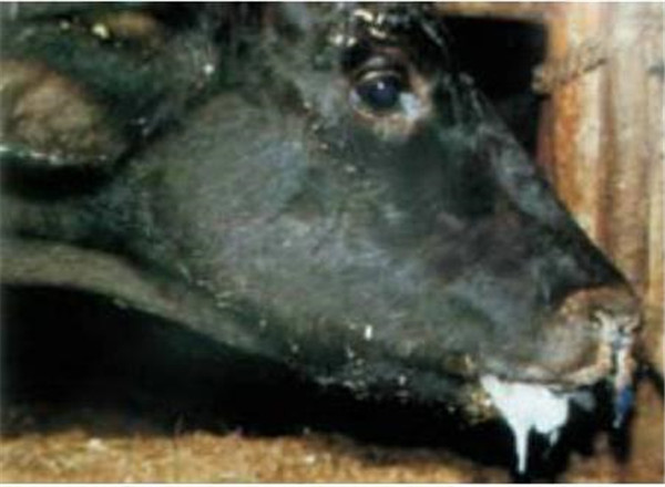 体温突然升高,达40~42.5℃, 2~3日后降至常温。精神沉郁,低头耷耳,鼻镜干燥,被毛粗乱。发热时伴有畏光流泪、结膜充血、呼吸急促、哼哼声、拒食、喉痛、反刍停止、流涕、流涎、四肢关节浮肿、僵硬、疼痛、倒卧;便秘或腹泻、尿混浊;妊娠母牛可发生流产,多数病程3~4日可恢复。重症1~3日可死亡,死亡率较低。发生该病的牛多数经过2~3天呈良性经过,但也有造成继发感染死亡病例,据报道,奶牛发病后呈全群爆发,发病率可达80%,死亡率6%左右,严重影响产奶量。