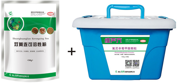 预防:双黄连可溶性粉400g+维严亢颗粒100g拌料200kg内服,连用1周,高温潮湿季节每月1次。