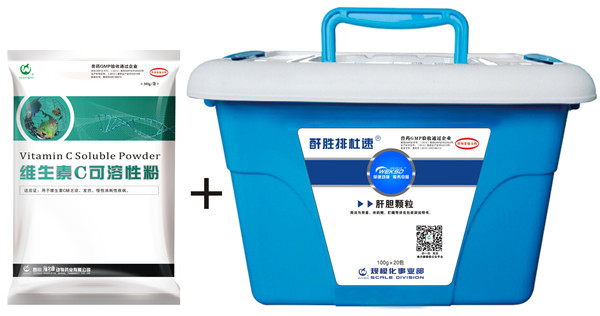 治疗期间全程配合100kg饮水添加维生素C可溶性粉100g+酐胜排杜速100g+葡萄糖5kg混饮。