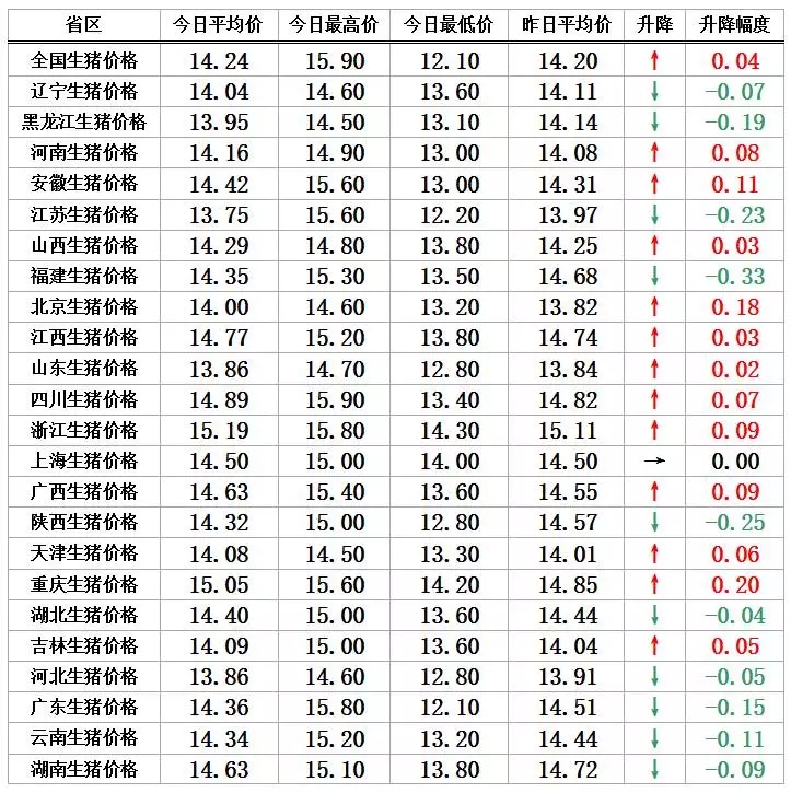今日全国生猪平均价格明显上涨,12个省份价格上涨,10个省份价格下跌,1个省份价格持平。