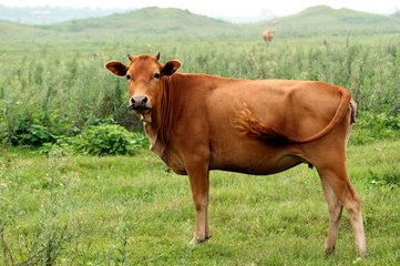 三、役用牛的外貌特征: 役用牛的体形,各部位对称而前躯特别发达,中躯较长,后躯紧凑。体质健壮,有持久力。体高和体长趋于相等。身体中心高于肉用牛而稍向前移。其被毛长而密,皮肤厚、致密而有弹性。全躯骨胳粗壮。筋肉发达,皮下结缔组织发育差。头大,额宽;颈粗壮有力,与前躯连接良好。体躯长、宽、深,鬐甲丰圆;胸围很大,腹部充实,这表现有力。尻长、平、宽度适中。呈水平尻的牛,迈步大而速度快;呈斜尻的牛,推进力大,但腿短步小,速度较慢,役牛的四肢特别发达。四肢骨胳要强大,肌健发达,肌肉和筋腱界限分明。蹄大而圆,蹄质致密、坚实。四肢的位置和蹄的方向要端正。前肢直、后肢弯者役力大。所谓“前脚直如箭快走不须鞭;后脚弯似弓,运步快如风”。