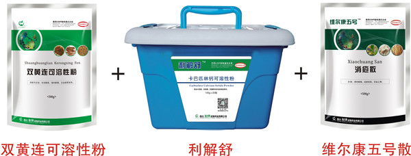 方案一、牛、羊:每1000kg饲料添加双黄连可溶性粉1000g+利解舒1000g+维尔康五号散1000g,连用5~7天。