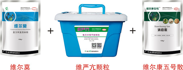 方案二、猪:每1000kg饲料添加维尔莫1000g+维严亢颗粒500g+维尔康五号散1000g,连用5~7天。