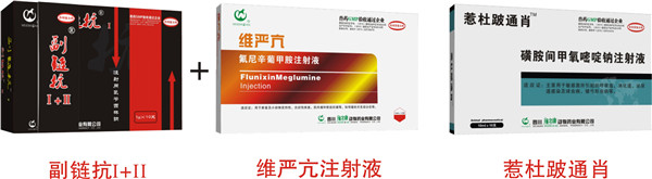 方案一、副链抗I+II0.2ml/kg体重+维严亢注射液0.05ml/kg体重,惹杜跛通肖0.2ml/kg体重,分点肌内注射,一日1次,连用3日,重症用量加倍。