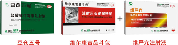 方案二、豆仓五号0.2ml/kg体重,维尔康吉品斗包5mg/kg体重+维严亢注射液0.05ml/kg体重,分点肌内注射,一日1次,连用3日,重症用量加倍。